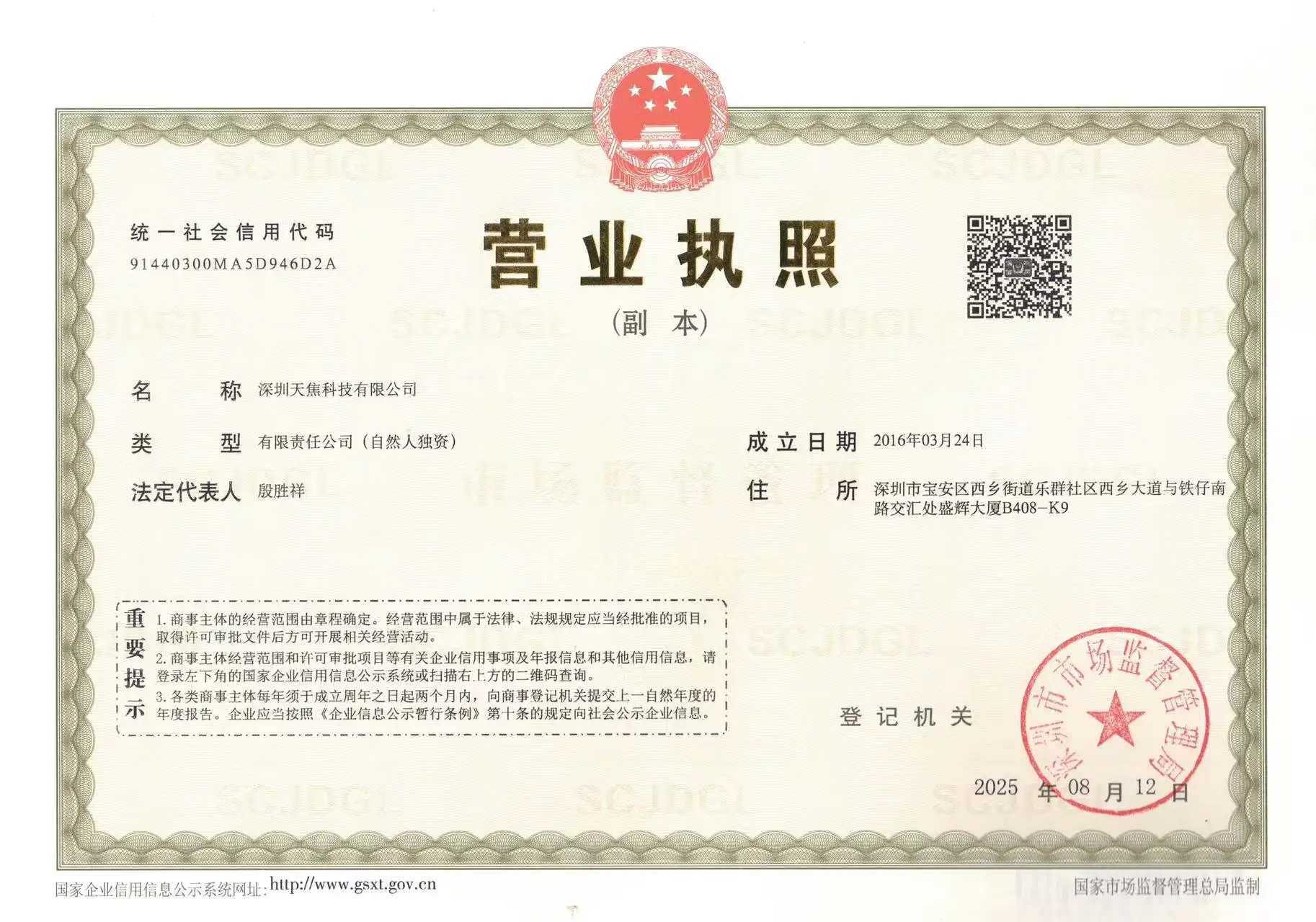 Registered address : B408-K9, Shenghui Building, Intersection Of Xixiang Avenue And Tiezai South Road, Lequn Community, Xixiang Street Shenzhen Guangdong China